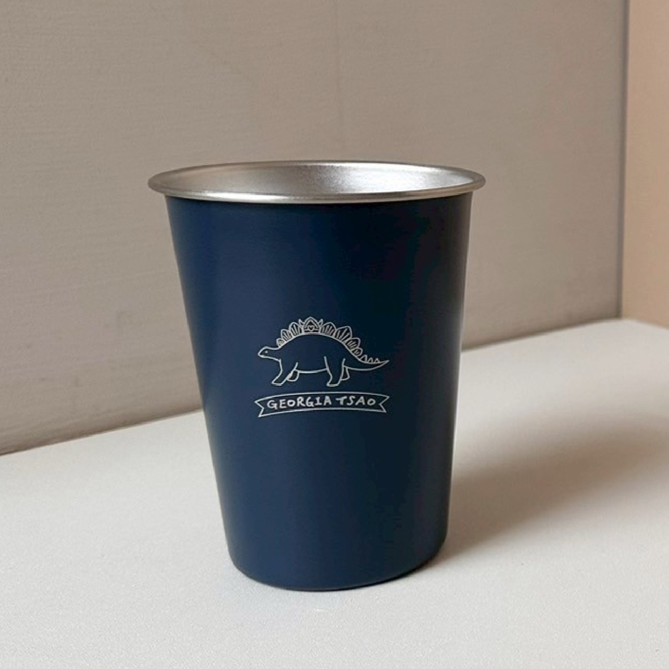 正面印有可愛的劍龍插畫與品牌識別「GEORGIA TSAO」,兼具趣味與質感,讓日常飲水也能成為時尚展現