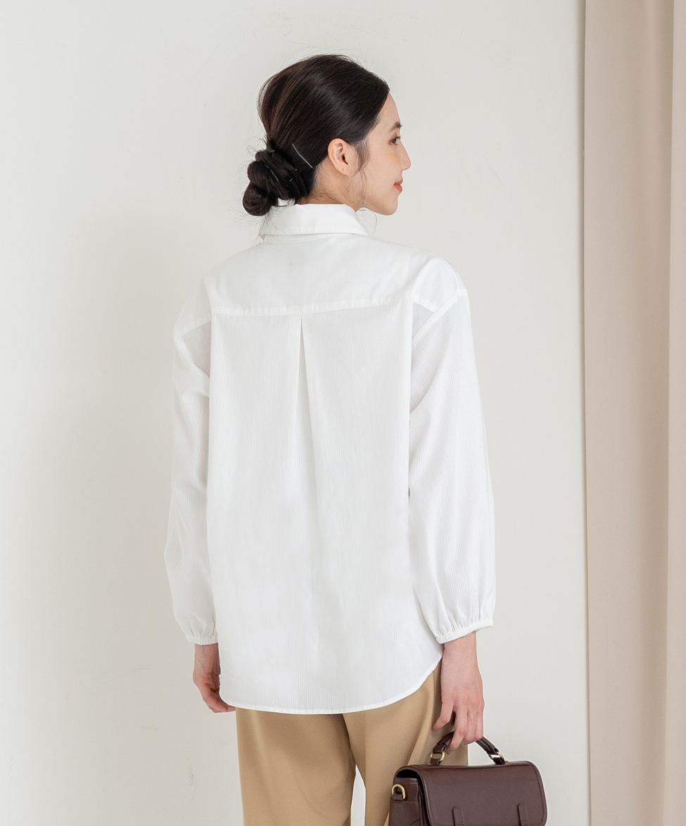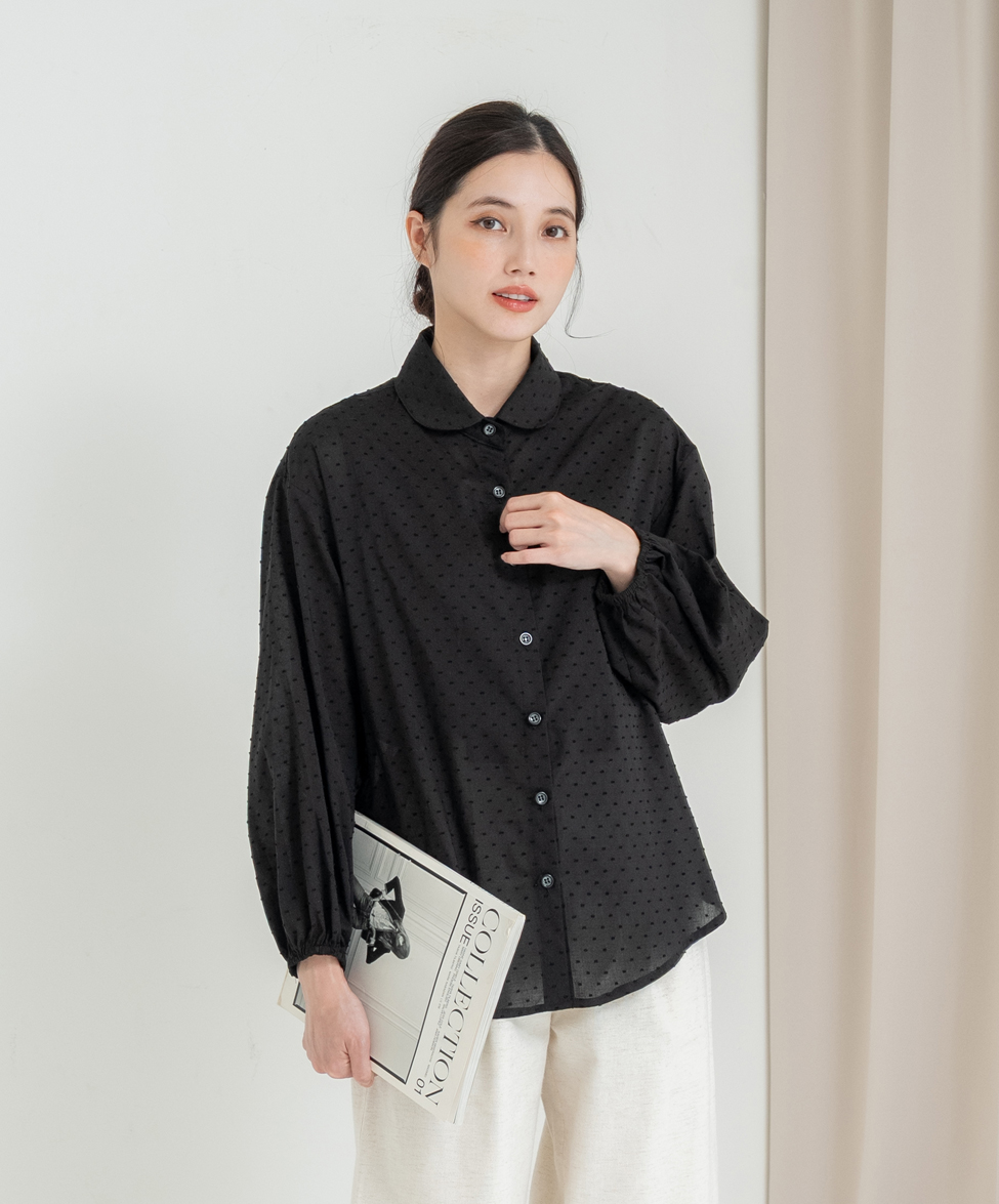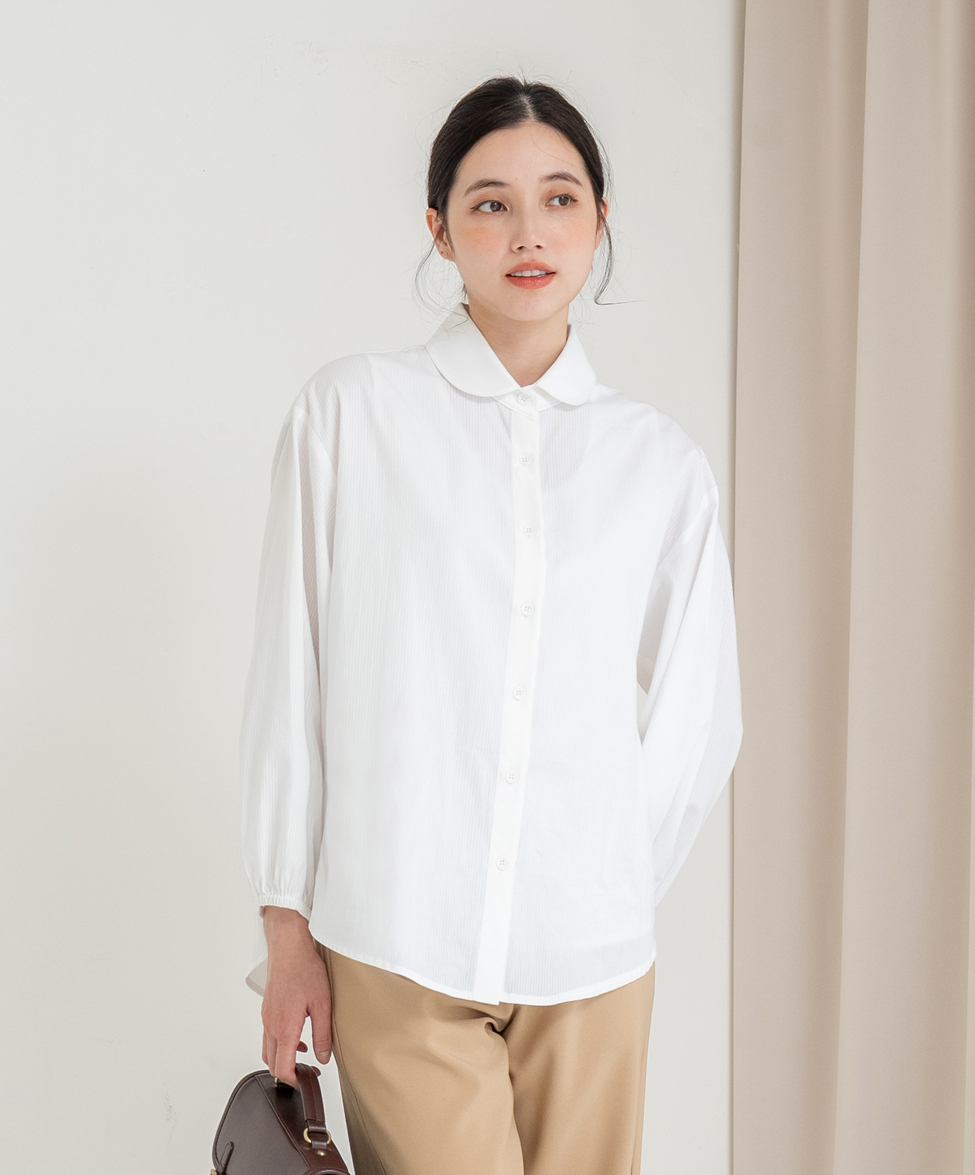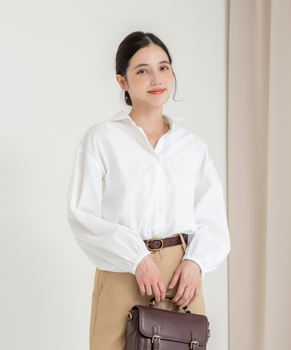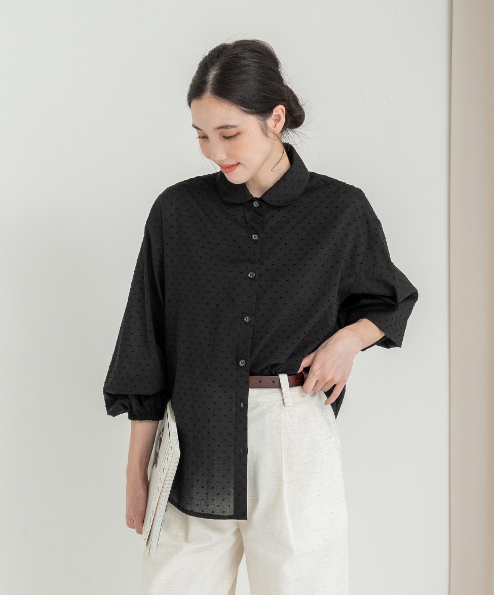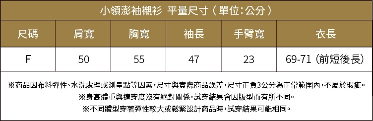 【版型介紹】 整體版型以微寬鬆輪廓為主利用後背中摺設計修飾肩背線條,讓上身線條更顯柔順自然小圓領剪裁微微收口,貼合頸部線條肩線略落肩搭配澎袖造型,營造輕鬆柔和的份量感下擺採圓弧下擺設計,前短後長的長度可自由內紮或放出修飾身形同時保有輕盈流動的視覺效果Model 穿S號