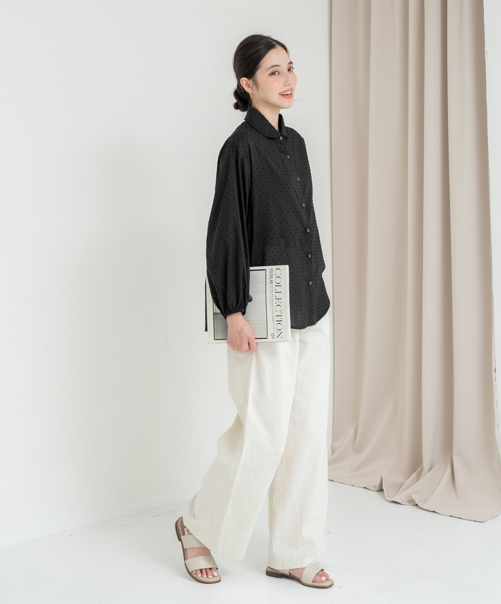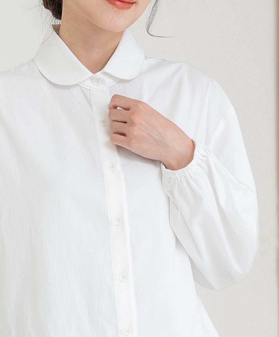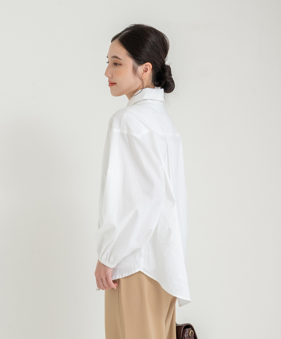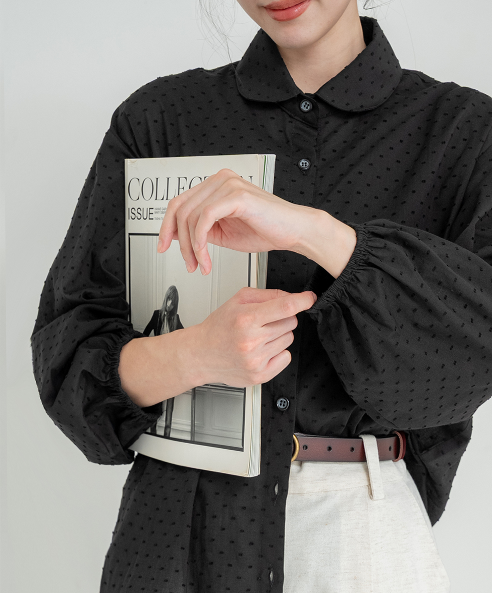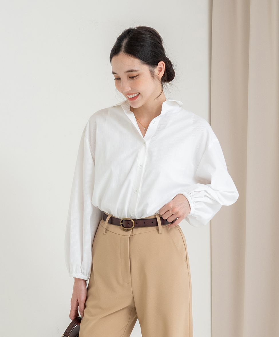 【版型介紹】 整體版型以微寬鬆輪廓為主利用後背中摺設計修飾肩背線條,讓上身線條更顯柔順自然小圓領剪裁微微收口,貼合頸部線條肩線略落肩搭配澎袖造型,營造輕鬆柔和的份量感下擺採圓弧下擺設計,前短後長的長度可自由內紮或放出修飾身形同時保有輕盈流動的視覺效果Model 穿S號
