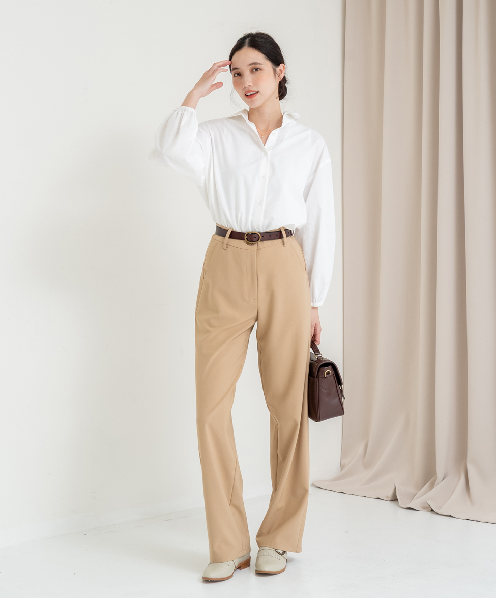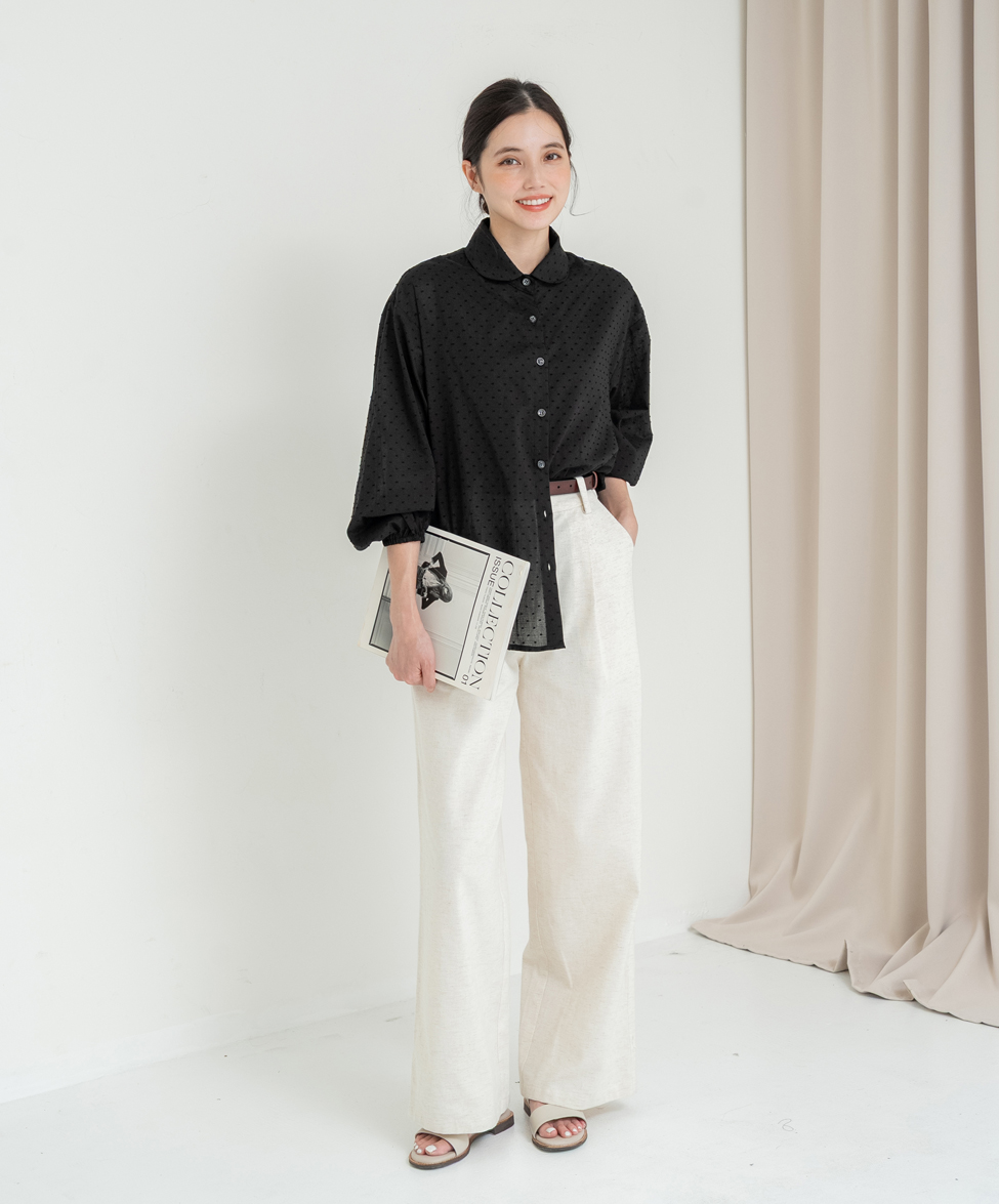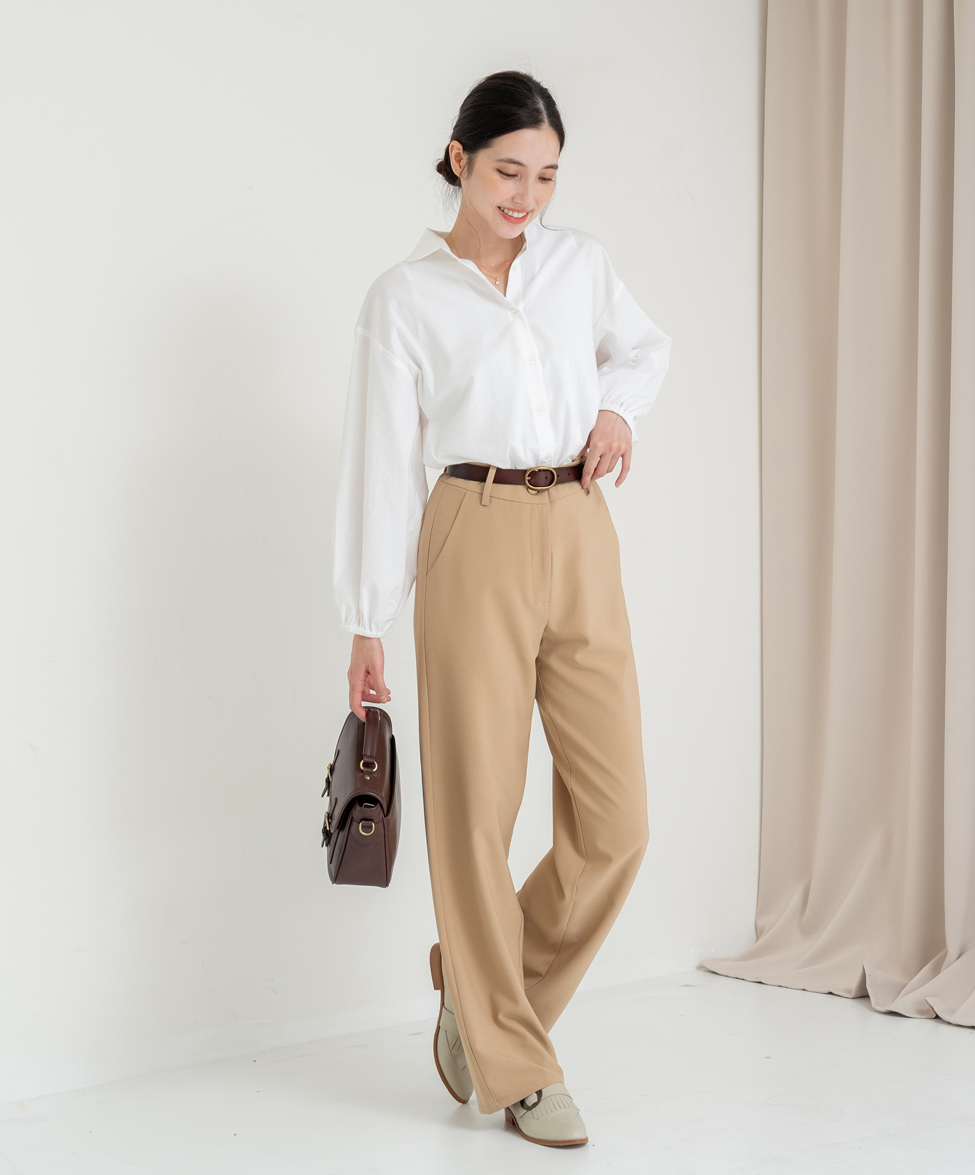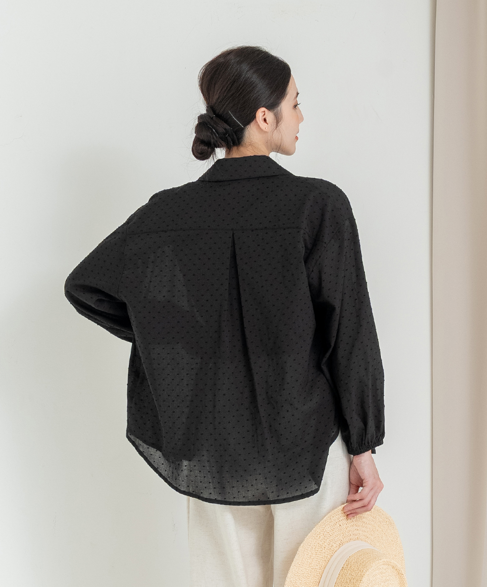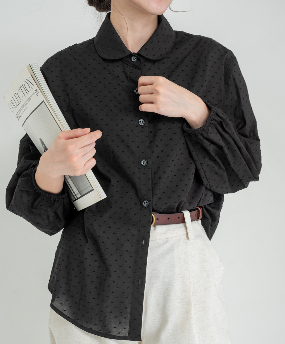 【版型介紹】 整體版型以微寬鬆輪廓為主利用後背中摺設計修飾肩背線條,讓上身線條更顯柔順自然小圓領剪裁微微收口,貼合頸部線條肩線略落肩搭配澎袖造型,營造輕鬆柔和的份量感下擺採圓弧下擺設計,前短後長的長度可自由內紮或放出修飾身形同時保有輕盈流動的視覺效果Model 穿S號