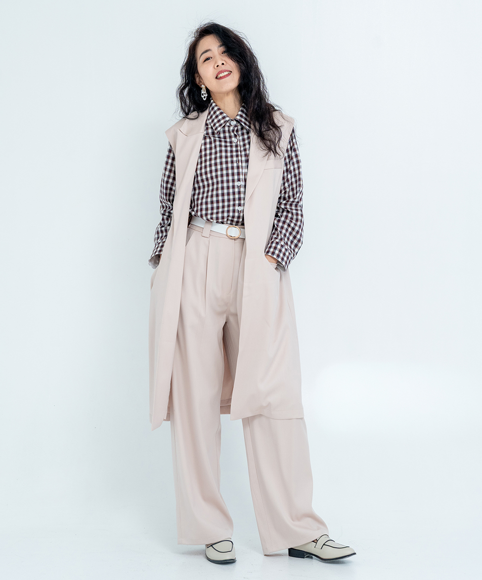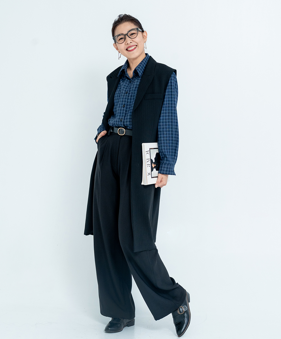 惠淇穿搭:低領長袖襯衫節奏寬褲GT全真皮小流蘇公爵平底鞋