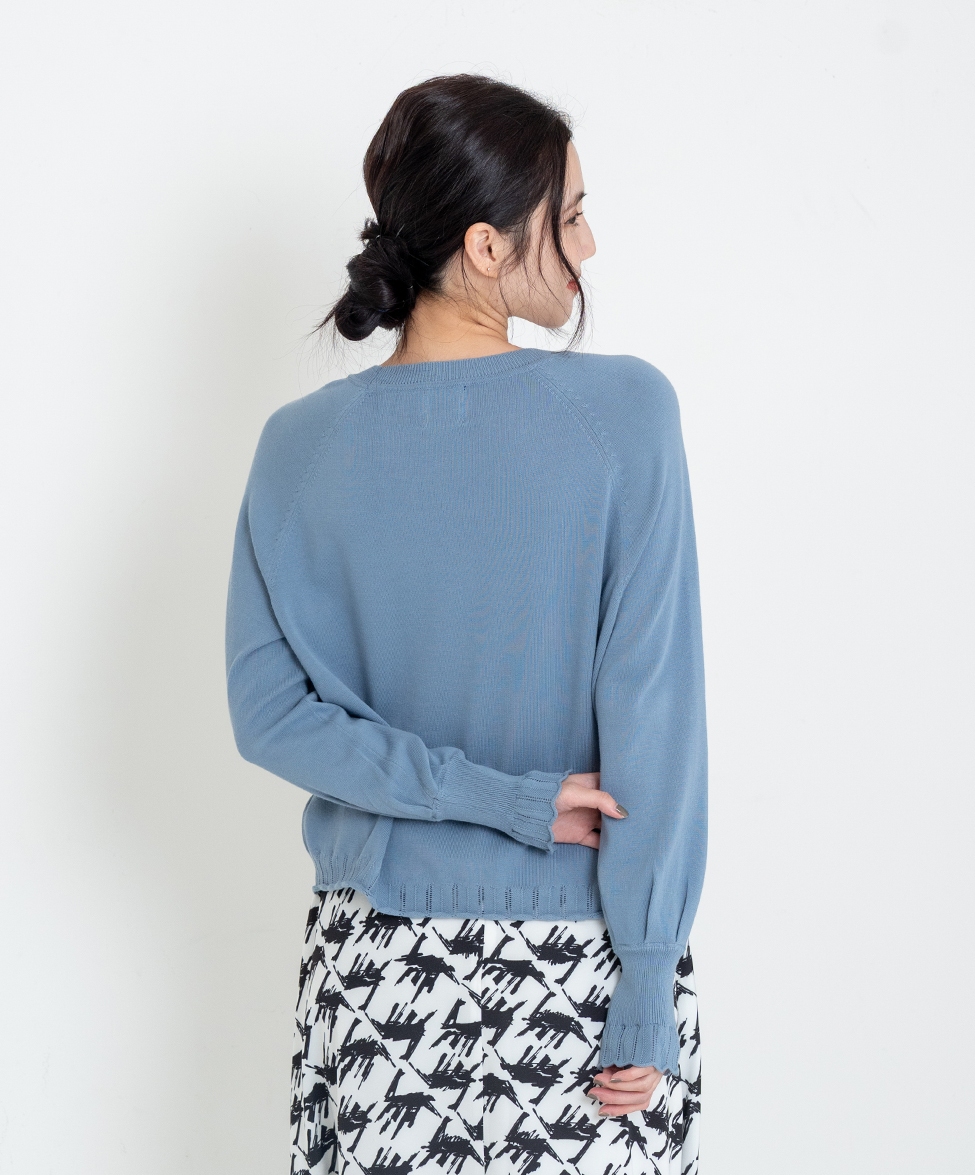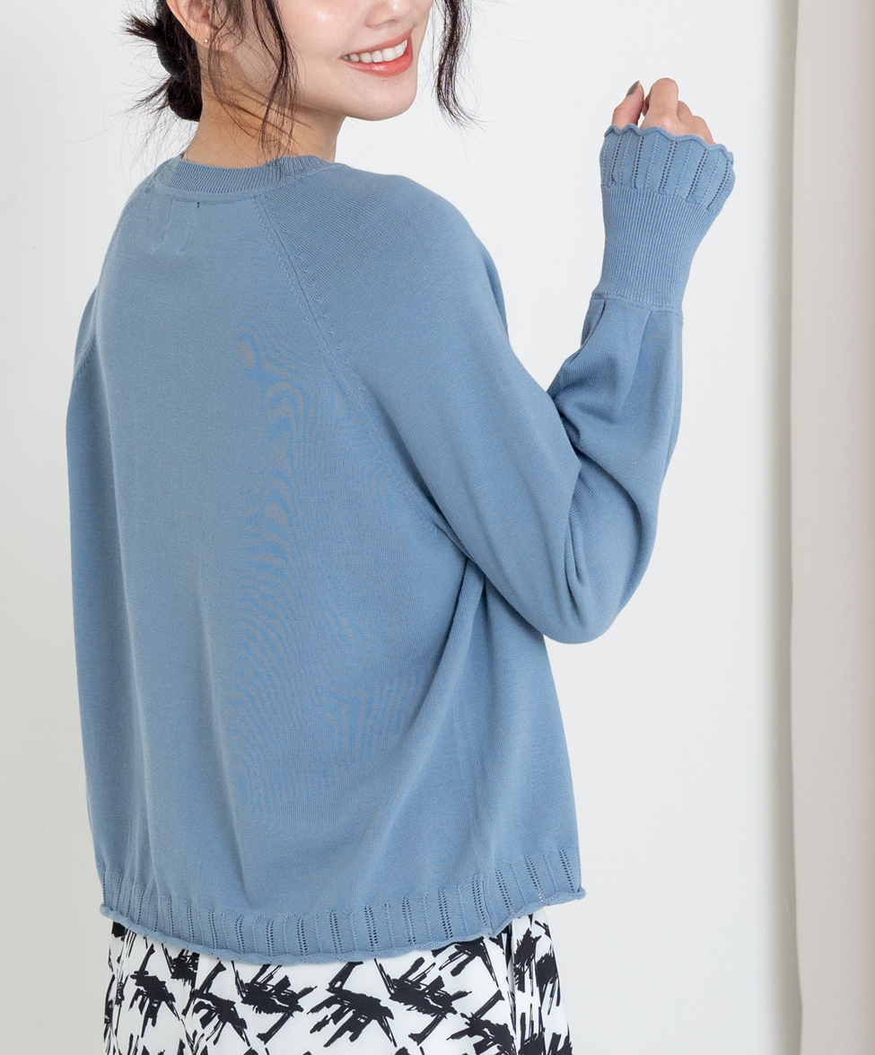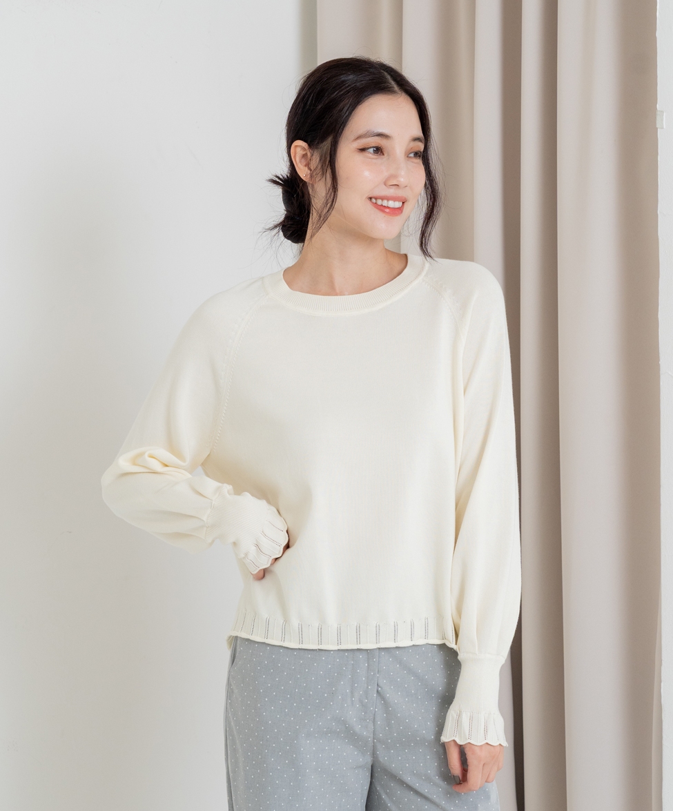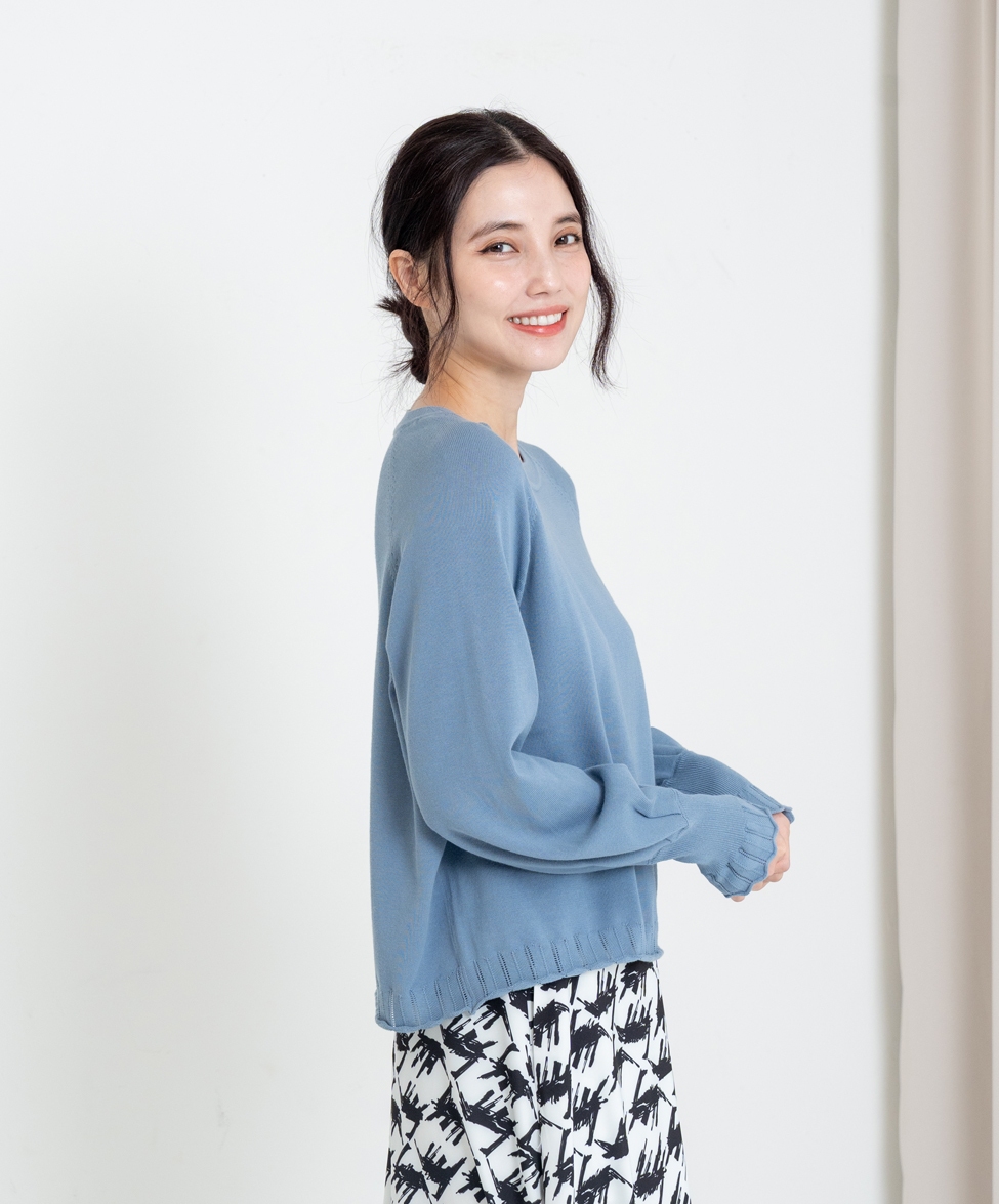 【版型說明】 拉克蘭袖寬鬆落肩、袖口與下擺有精緻雕花,波浪線條勾勒出高級感。高撚棉材質柔軟舒適,不易起球。